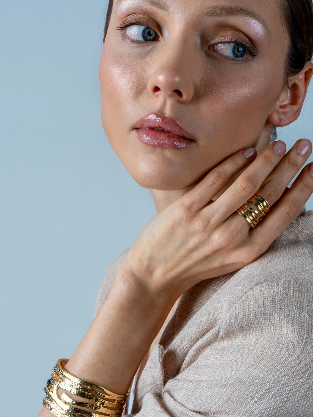 The Dream Bracelet & Ring Set is a luxurious and elegant jewelry duo designed to reflect timeless beauty and sophistication. Crafted entirely by hand, this set features a bronze base plated with 22K gold, offering a radiant glow and artisanal charm. The refined, minimalist design adds a golden touch to both everyday outfits and formal occasions, making it a versatile staple in any jewelry collection.